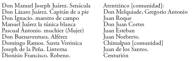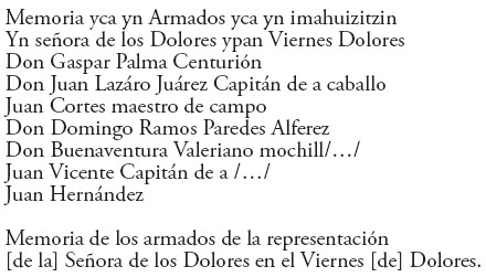 En este mismo archivo se encuentra un fragmento de una memoria que habla sobre la distribución de los personajes en la representación del viernes de Dolores en Santa María Atlihuetzia:21