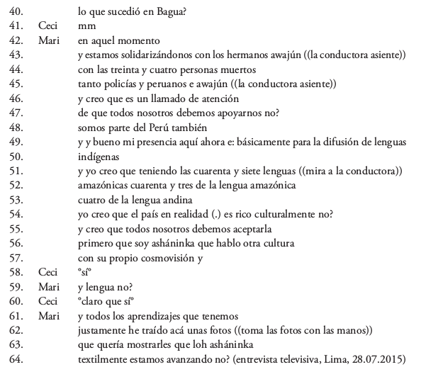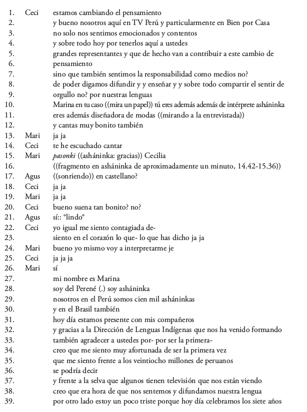 En este fragmento la capacitada es posicionada como intérprete, diseñadora de modas y buena cantante (turnos 10-14). Después de un turno inusualmente largo en su lengua originaria, el director de la DLI solicita una traducción al castellano (17), expresando la incomodidad del grupo frente a la infrecuente experiencia de incomprensión ante cámaras. La conductora evalúa estéticamente el parlamento de Marina (20) y esta evaluación es confirmada por Panizo (21). Luego, la conductora afirma tener una comprensión ‘profunda’, emocional, de lo dicho (22-23). A raíz de la heteroselección o invitación de turno hecha por Panizo (17), la capacitada se anuncia como su propia intérprete en 24, y así da inicio a un largo turno que conjuga varios actos de habla: una presentación que enfatiza la procedencia geográfica y la pertenencia étnica (27-28), una aseveración sobre la densidad poblacional y el carácter transfronterizo del pueblo asháninka (29-30), el agradecimiento a la DLI por la formación impartida (32) y al canal estatal por la invitación (33), así como una evaluación sobre la importancia de la presencia de la lengua indígena en un medio masivo de comunicación por “primera vez” (34-38).