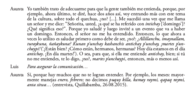 Asunta se considera a sí misma como hablante de una variedad baja de quechua (o ‘quechuañol’) que busca ‘mejorar’ mediante el uso de los términos oscuros impuestos como correctos por la Academia Mayor de la Lengua Quechua del Cuzco (AMLQ). Sin embargo, como comunicadora, ella ha confirmado que estas palabras no son entendidas por la mayoría de sus oyentes. En el siguiente fragmento, explica cómo intenta resolver los impases comunicativos que surgen para los nombres de los días de la semana: