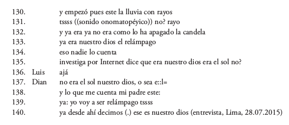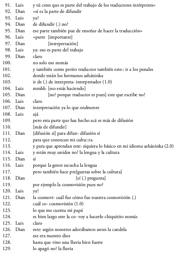 El fragmento se inicia con un ‘abrochamiento’ o ausencia de pausa en la transición de turnos entre ambos interactuantes (turnos 91-92). Este hecho muestra la rapidez de Diana al responder a la pregunta sobre la inclusión de las tareas de promoción lingüística y cultural en el rol del traductor intérprete. En 99-103 ella aporta información nueva sobre su ejercicio profesional: está interpretando a los asháninkas recluidos en los penales por causas que no especifica. En 104 el entrevistador da una respuesta de apoyo ante esta información, pero ha tardado mucho, a juzgar por la pausa en 103. Tal vez por ello Diana no desarrolla este tema. Después de una breve aclaración sobre las diferencias entre traducción e interpretación por parte de la entrevistada (105-107), el entrevistador insiste con más énfasis (usando el conector de contraste pero) en el tema de la difusión lingüística y cultural (109), intentando enfocar nuevamente la interacción en el reciente taller. Diana responde afirmativamente, explicitando en su respuesta la estrecha integración entre lengua y cultura (112-113). El entrevistador reformula el tema de manera más abstracta en 114 y lo concreta en 116-117, a lo que Diana responde proponiendo la etiqueta de “cosmovisión” (119, 121-122), como citando lo que suele preguntar el público en los talleres. En este punto, es llamativo que, sin mediar una invitación del entrevistador, ella se autoseleccione para un largo turno anunciando que desarrollará la “cosmovisión” “chiquitito nomás” (124). Después de la tardía aceptación de Luis (125), empieza a narrar un relato ancestral, no transcrito en su integridad, que fue transmitido a ella por su padre (123, 138) y que explica el origen de los ‘verdaderos’ dioses asháninkas, en oposición a los que aparecen mencionados en Internet (135).