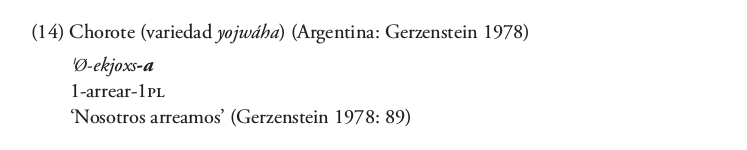 En chorote no se registraron morfemas específicos que permitan codificar una escisión en la primera persona plural. En la variedad yojwáha (variedad 1), Gerzenstein (1978: 87-92) describe el uso de un morfema discontinuo compuesto por el prefijo de primera persona singular más un sufijo que codifica primera persona plural (14). Es decir, se recurre al mismo tipo de morfema que en las lenguas guaycurúes en las que ocurre una única forma para codificar primera persona no-singular en los verbos.