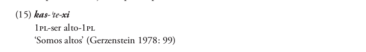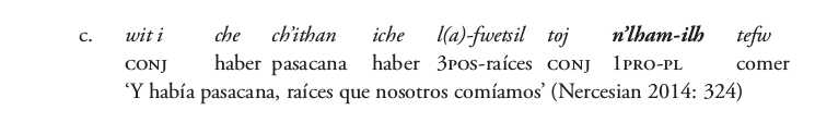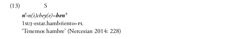 A su vez, la autora presenta el uso de un morfema discontinuo compuesto por el prefijo de primera persona singular más el clítico de plural =hen para codificar primera persona plural exclusiva cuando funciona como S (13).