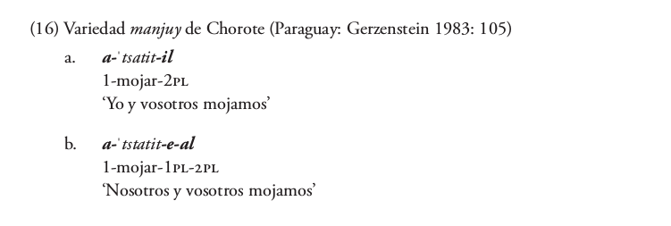 En la variedad manjuy (Paraguay), Gerzenstein (1983: 105) describe la posibilidad de combinar en un mismo verbo prefijos de primera persona singular o plural con un sufijo de segunda persona plural con el significado de ‘yo y vosotros hacemos X’ (16a), y ‘nosotros y vosotros hacemos X’ (16b).