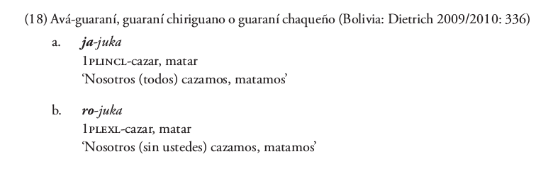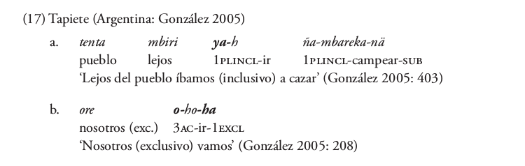 En proto tupí-guaraní y otras lenguas de la familia tupí-guaraní como sirionó, yuki y avá-guaraní (18) (Crevels & Muysken 2005: 324-325; Dietrich 2009/2010: 336), los morfemas que codifican primera persona plural inclusiva y exclusiva son prefijos, mientras que, siguiendo lo planteado por González (2005), en tapiete (17) se trata de un prefijo y un morfema discontinuo. Es decir, se observa, en esta última lengua, un patrón morfológico similar al de las lenguas mataco-mataguayas –sobre todo maká y nivaclé– y al de la variedad de toba occidental del Pilcomayo Medio.