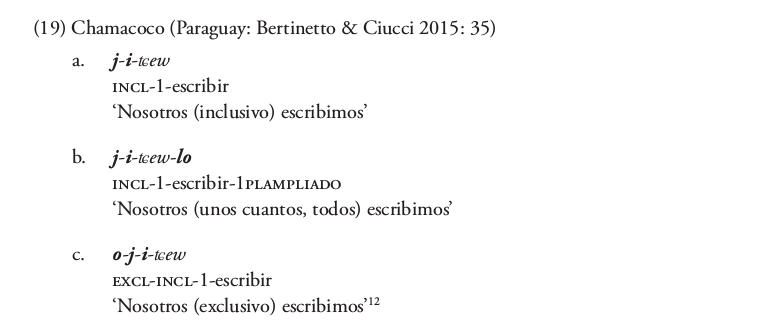 Según Ciucci (2009: 5) y Bertinetto & Ciucci (2015: 33-39), en chamacoco, de la familia zamuco, se observa una distinción entre primera persona no-singular inclusiva –plural y plural ampliado– y exclusiva (19), no registrada en otras lenguas de la misma familia: ayoreo y zamuco antiguo.