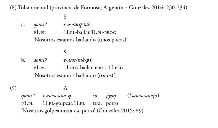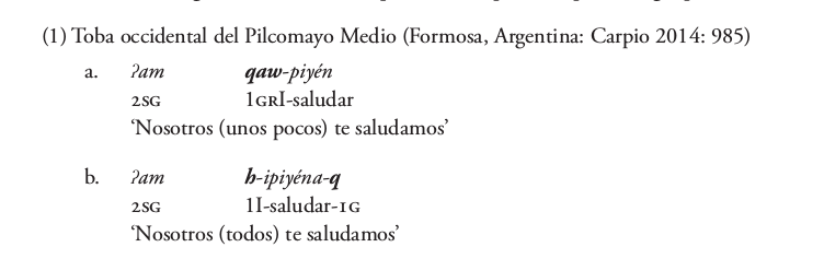 En toba oriental (provincia de Formosa, Argentina), según González (2016: 230-234), se utiliza un único morfema discontinuo para codificar primera persona no-singular –compuesto por el prefijo de primera persona singular más el sufijo de plural de primera persona -(a)q (y sus alomorfos)– excepto cuando se trata de la primera persona no-singular S en los índices pronominales tipo I donde ocurre una escisión en términos de grupo y grupo restringido; ambos codificados a través de un morfema discontinuo compuesto por el prefijo de primera persona singular más los sufijos -(a)q ‘primera persona plural’ (8a) y -pi ‘colectivo’ (8b), respectivamente. En el resto de los índices pronominales solo se detectó el primer morfema (9), al igual que en toba meridional, pilagá, mocoví, mbayá y abipón.
