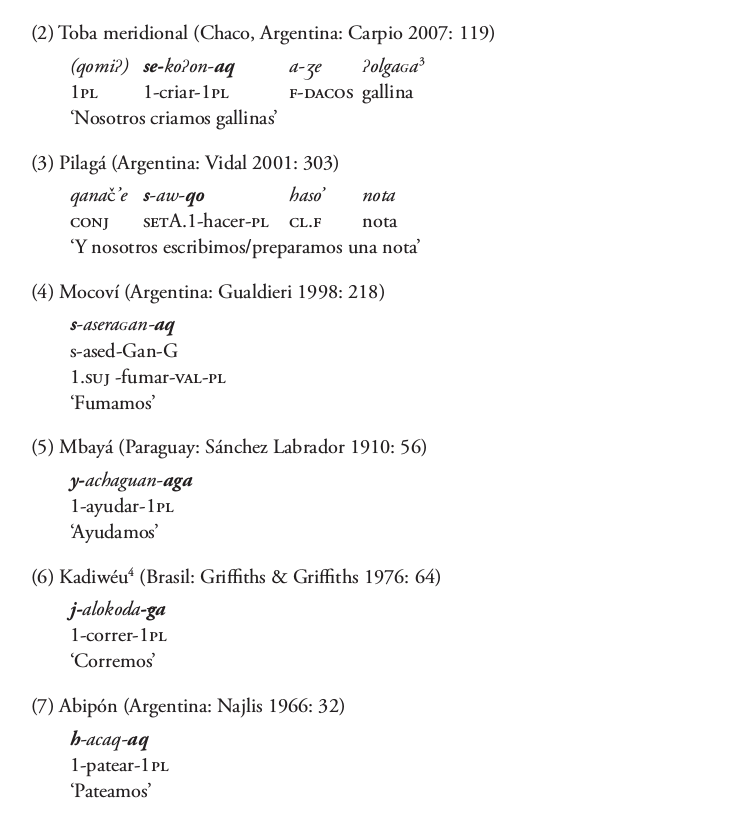 En las variedades más meridionales de toba (provincia de Chaco, Argentina: Buckwalter 1980; Carpio 2007; Censabella 2002; Klein 1981; Messineo 2003) (2), pilagá (Argentina: Vidal 2001) (3), mocoví (Argentina: Gualdieri 1998; Grondona 1998) (4), kadiwéu (Brasil: Griffiths & Griffiths 1976; Sandalo 1995) (5), mbayá (Paraguay: Sánchez Labrador 1910) (6), y abipón (Argentina: Najlis 1966)2 (7) ocurre un único morfema verbal discontinuo que codifica primera persona no-singular, compuesto por el prefijo de primera persona singular más el sufijo -aq (y sus alomorfos) que codifica plural de primera persona.