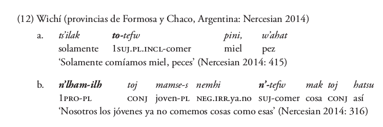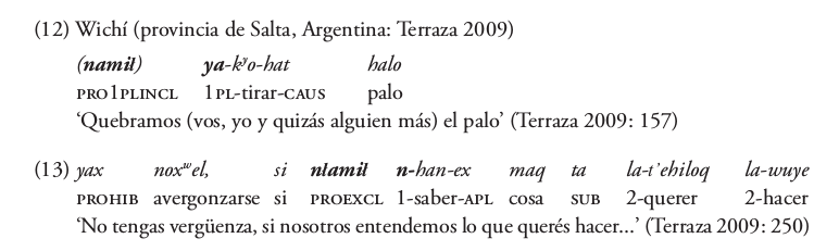 En la variedad de wichí de Rivadavia (Salta, Argentina), según Terraza (2009: 100, 119-124), la oposición inclusivo/exclusivo se codifica en los verbos mediante un prefijo (12) y del pronombre libre de primera persona exclusiva junto al verbo con flexión de primera persona singular (13), respectivamente.10 Una distinción similar fue descripta por Spinelli (2015: 238-240) en la variedad de wichí de Santa Victoria (Salta, Argentina).