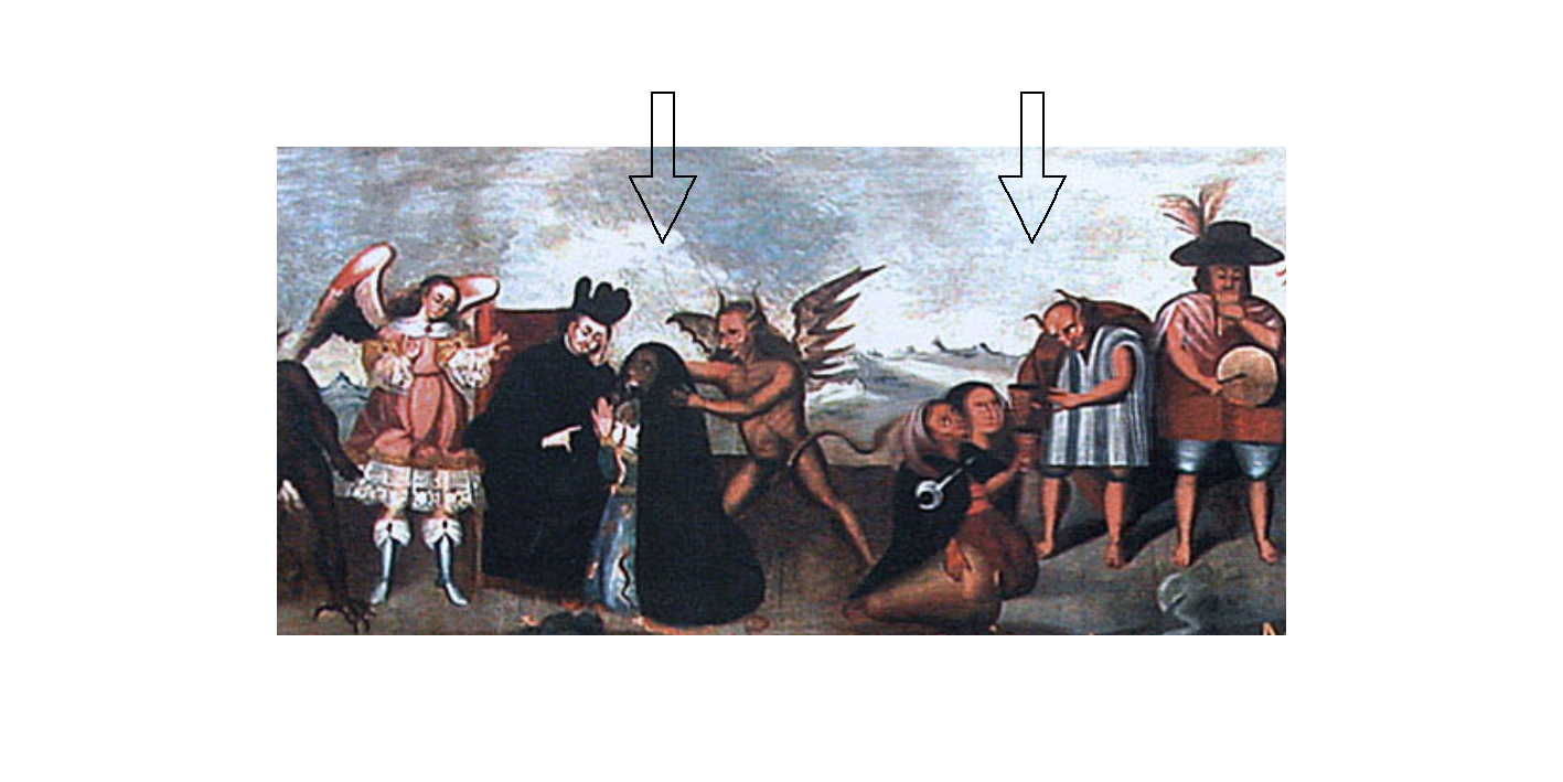 Sabemos que los sacerdotes eran de la opinión que la religión y cultura cristiana eran expresión de la civilización más desarrollada, y algunos formulan claramente la demonización de lo indígena. Entre los misioneros estudiados aquí está Tapia que describe a los cumanagotos como de corta capacidad, torpes, y rudos; son bestias y mentirosos. El hecho de que apenas saben contar, según él, influye en su incapacidad de confesarse bien (Sarion, sección 5). Los sacerdotes indígenas enseñan los engaños del demonio (Sarion, sección 7); aquí resuena un sermón del Tercer Concilio Provincial de Lima en el cual queda clara la categorización de los sacerdotes indígenas como ministros del diablo (Tercero cathecismo 1585, sermón XIX, f. 109r). Esto también se puede apreciar en una representación visual (Figura 2) en la cual el sacerdote indígena, con cuernos de diablo, da un quero a una pareja, ¿haciendo burla de la comunión o queriendo imitarla? [flecha a la derecha], y ‒a la izquierda de esta escena‒ el diablo tienta y seduce a los indígenas que se confiesan [flecha a la izquierda] (ver Gisbert & de Mesa 2010).