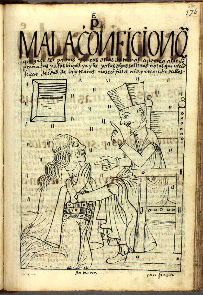 El rito de la confesión empezaba ‒de manera parecida en Europa y América‒ con un examen de conciencia y preguntas generales. Se solía practicar una vez por año y por un sacerdote externo. En las Américas se debe imaginar enmarcada en otras acciones rituales, como por ejemplo un acto de extirpación de idolatría o sermones que lo precedían o seguían, pero la parte principal se componía de los diez (o, resumidos, de ocho) mandamientos, terminando con una exhortación a la penitencia. (Azoulai 1993: 58-65.)