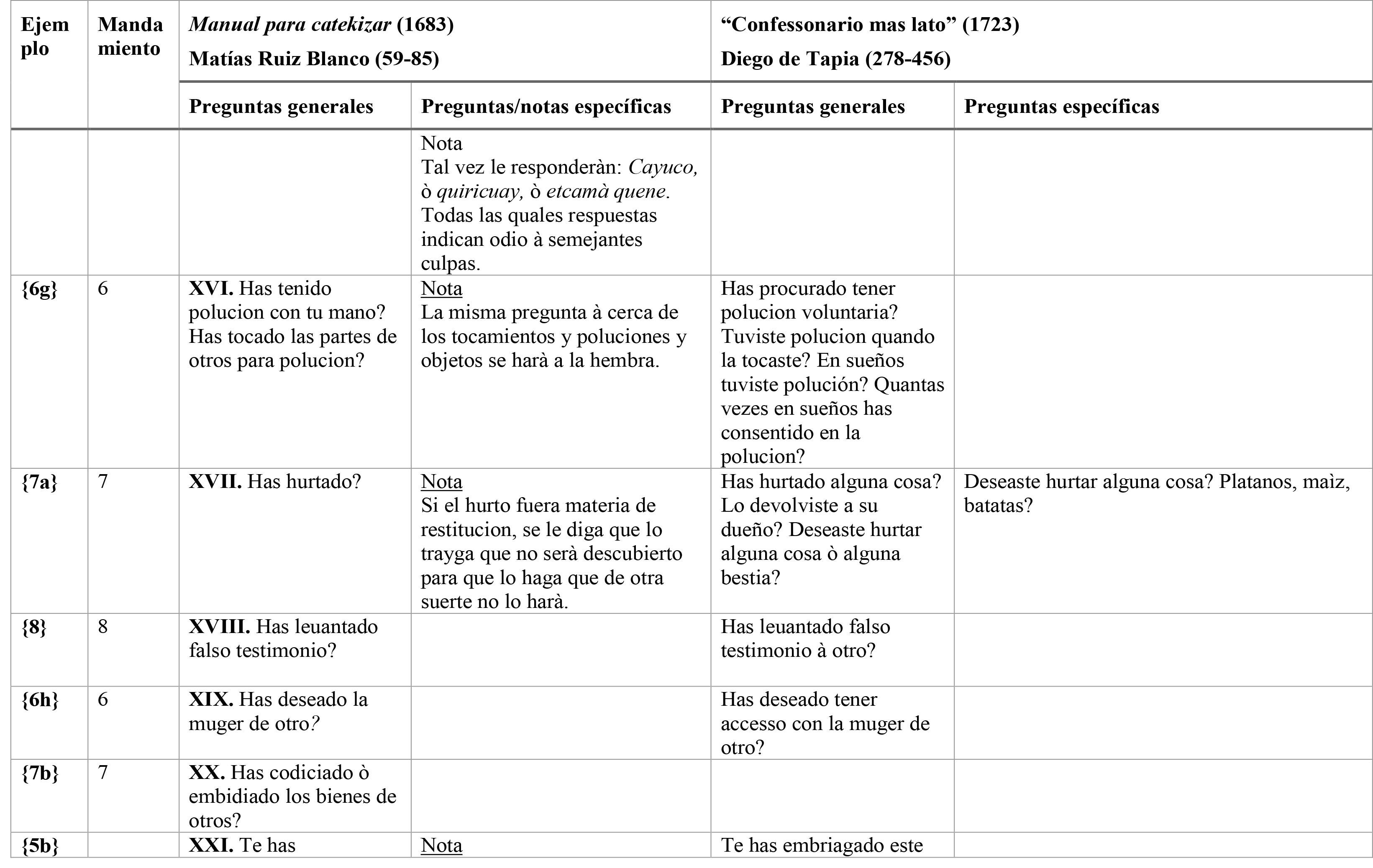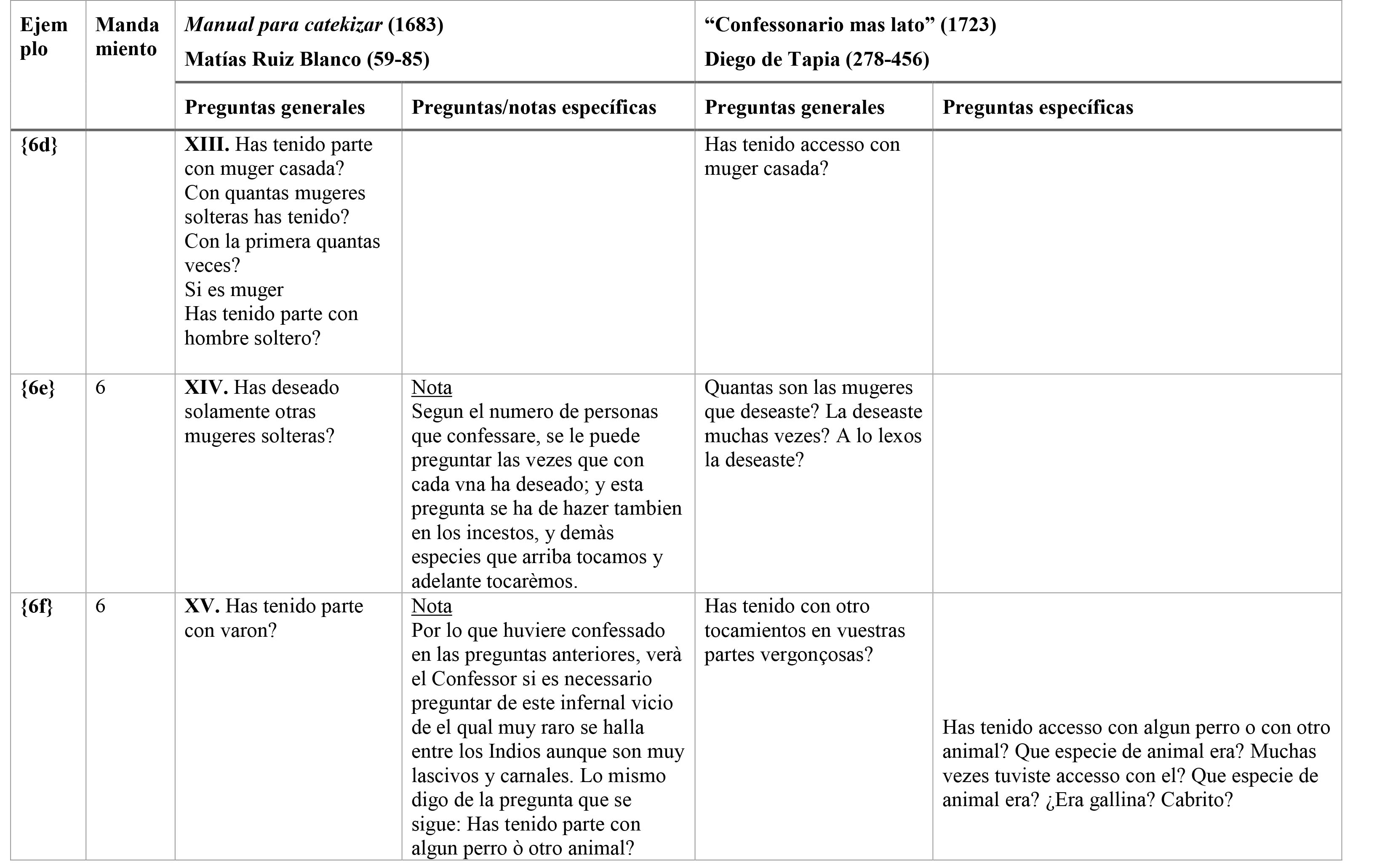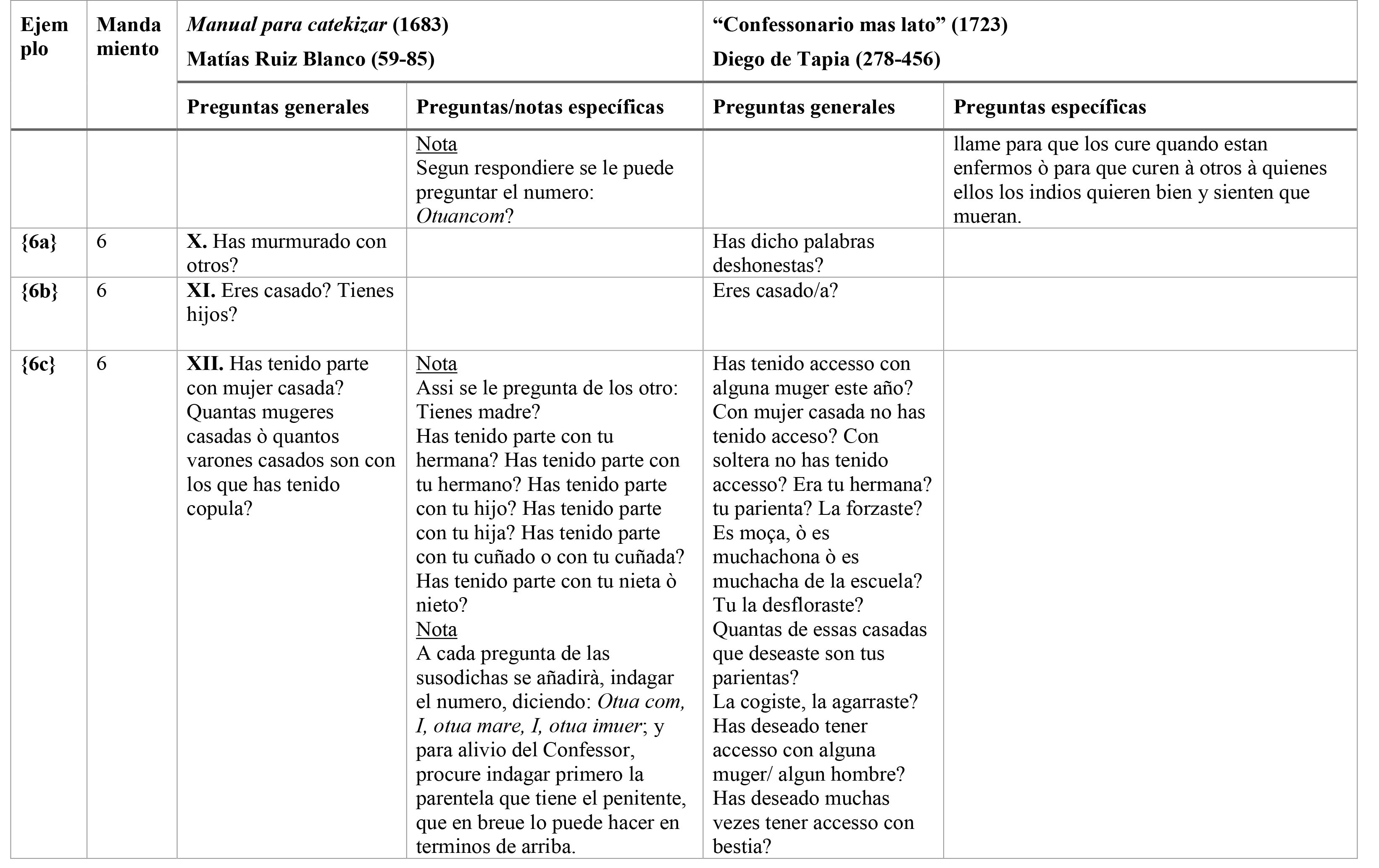 Curiosamente, en el sexto mandamiento donde Tapia se excede con preguntas detalladas acerca del amancebamiento, las relaciones sexuales con o sin violencia, la masturbación, la homosexualidad, la bestialidad, etc., no se encuentran apenas preguntas específicas que desvelen prácticas típicamente indígenas, a excepción de aquellas preguntas sobre las relaciones incestuosas. Es Ruiz Blanco {6c} quien insiste en la relación de parentesco con reiteradas preguntas: “Has tenido parte con tu madre? Has tenido parte con tu hermana? Has tenido parte con tu hija? Has tenido parte con tu cuñado o con tu cuñada? Has tenido parte con tu nieta ò nieto?” (Ruiz Blanco 1683: 74).