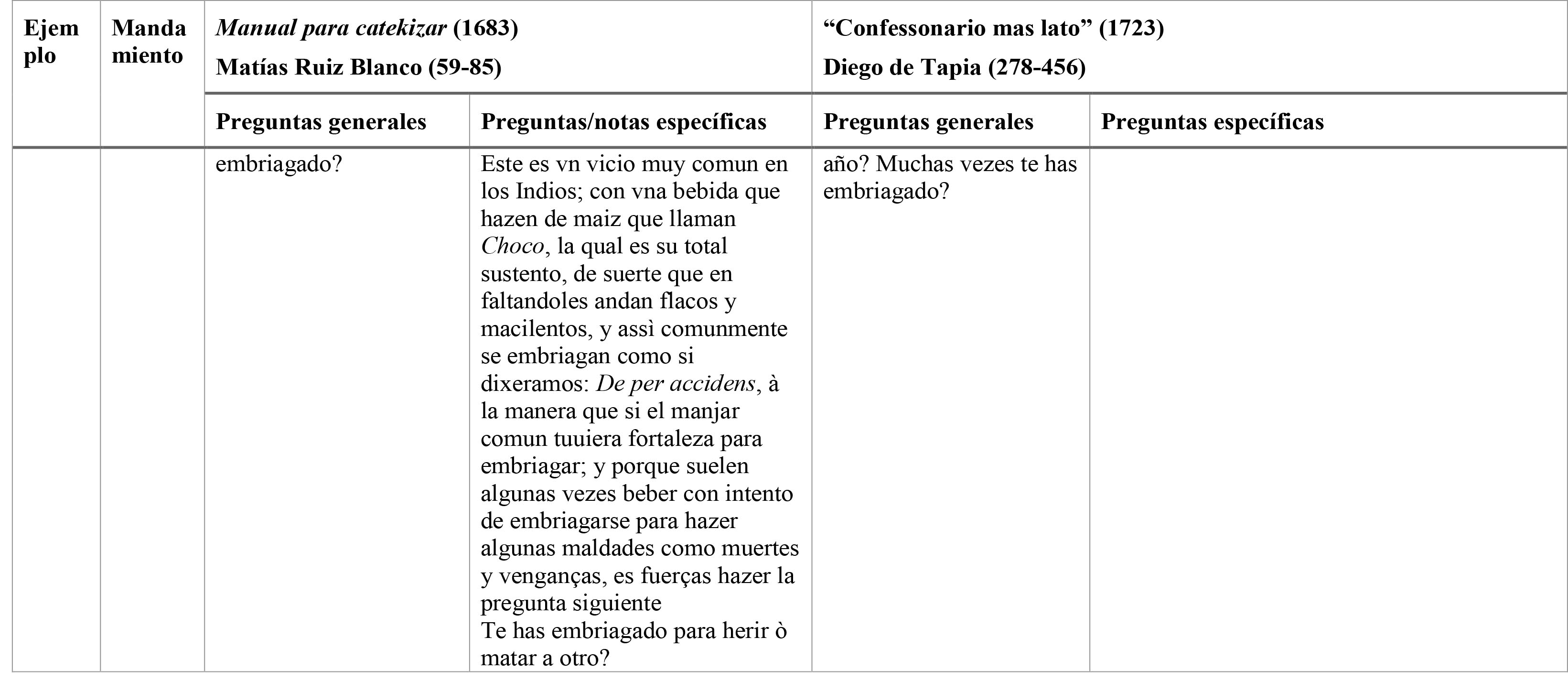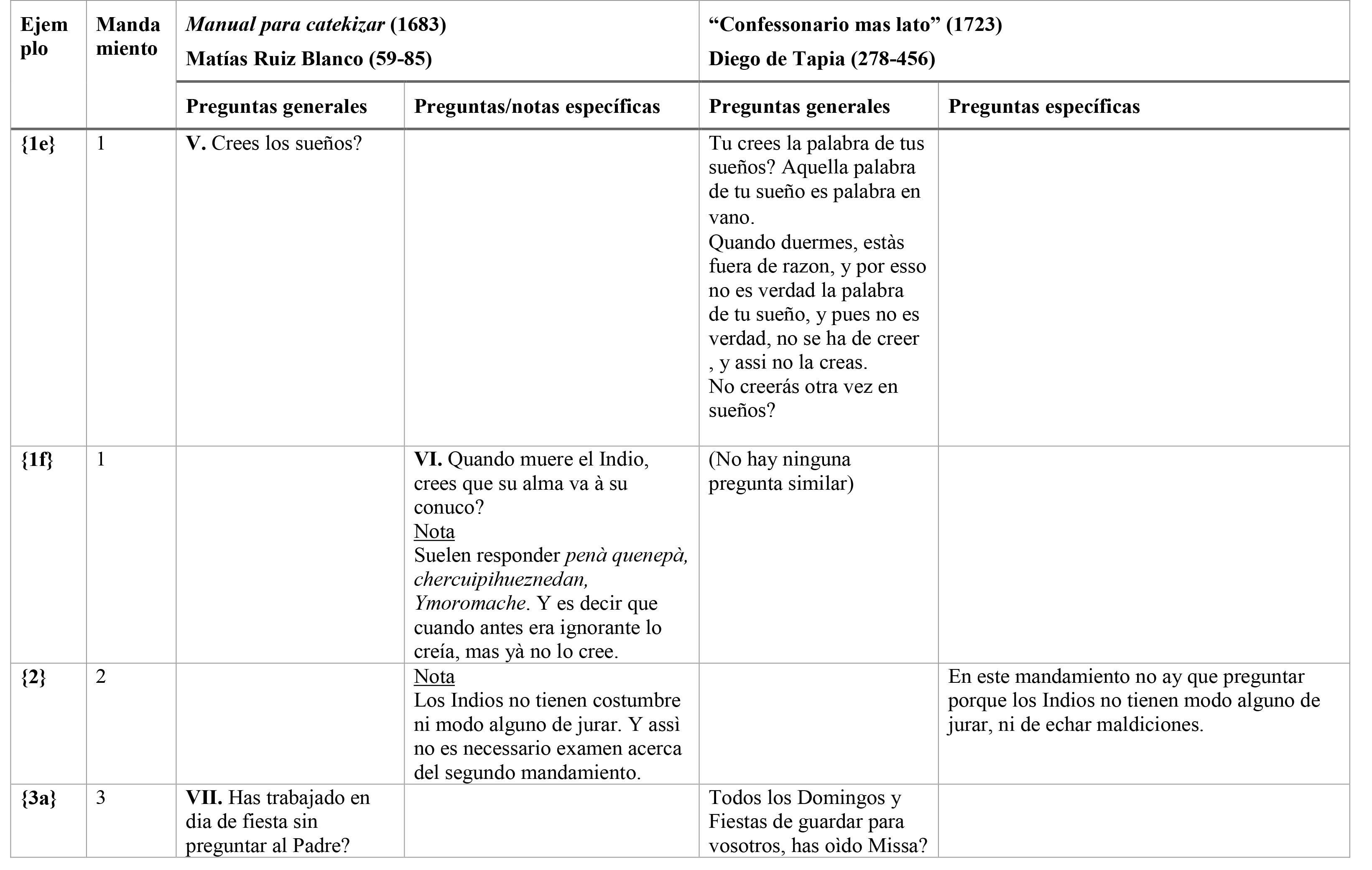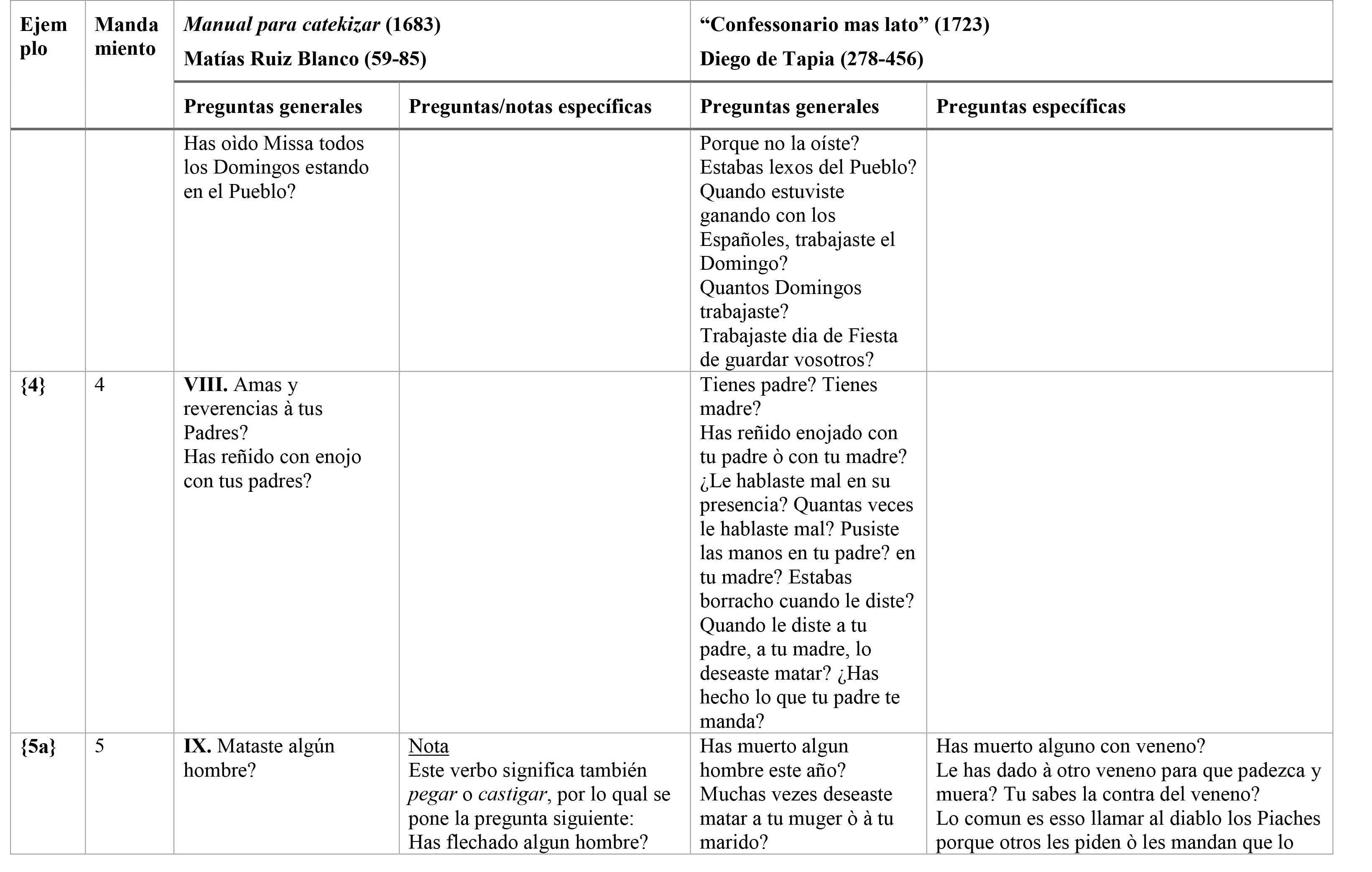 Así, las preguntas formuladas en los confesionarios coloniales toman la estructura de una guía práctica para dar a conocer ciertas prácticas y tradiciones, dentro de las cuales la sexualidad ocupaba un lugar principal tanto en Europa como en América, los hábitos cotidianos, los principios morales y ritos indígenas. De igual modo, Tapia busca una asociación entre los pecados correspondientes a los diez mandamientos y aquellos rasgos específicos para la cultura cumanagota que contribuyen a la demonización de las prácticas consideradas pecaminosas y estigmatizadas por el imaginario católico europeo. A fin de destacar las implicaciones culturales que subyacen en el interrogatorio penitencial de Tapia, a continuación se ofrece un análisis comparativo entre las preguntas específicas para el contexto indígena presentes en el Manual para catekizar (1683) de Matías Ruiz Blanco y el Confessonario mas lato (1723) de Diego de Tapia (véase el Apéndice).