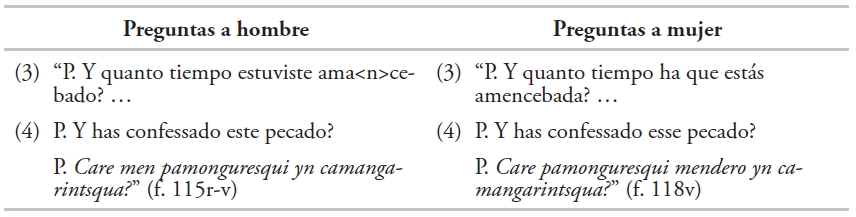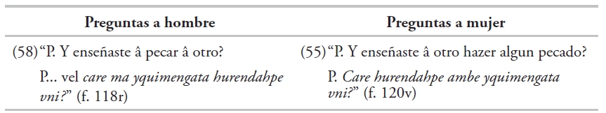 A diferencia de la mención de la actividad sexual, como se ejemplificó en la sección anterior, los frailes harán uso de la traducción al tarasco de la expresión castellana que utilizan en algunas preguntas para el hombre: “(25) P. Y era tu Cuñada, ô has conocido â tu Cuñada?” (f. 116v), así como para la mujer: “(39) P. Y los hombres que conociste eran parientes entre sí?” (f. 120r). Con esta fórmula, expresada en tarasco con el verbo miteni, buscan obtener información, no sobre el acto mismo, sino sobre la relación de parentesco o el estado civil de las personas que incurren en pecado: