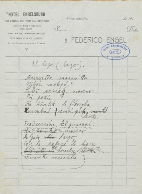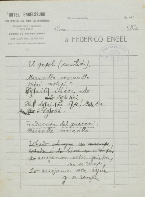 Parte de este vasto acervo es un conjunto de notas manuscritas realizadas por el etnólogo alemán durante un viaje entre las ciudades paraguayas de Encarnación y Asunción en septiembre de 1911, agrupadas bajo el título Adivinanzas paraguayas: apuntado en el viaje en ferrocarril desde Asunción hasta Encarnación (1911a). Estas notas se encuentran actualmente en la sección ‘Legados’ (N-0070 w 39) del IAI. Los apuntes contienen un total de 17 adivinanzas en guaraní con sus respectivas respuestas y traducciones al castellano.