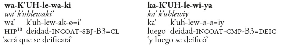 Debido al carácter incoativo del sufijo -lew, habría que prestarle atención a la traducción que se les ha dado previamente a nuestros ejemplos de Chichén Itzá. Todos los autores que han tratado los ejemplos de los Dinteles 1A y 4A de Las Monjas sugieren que se trata de verbo ‘adorar’. Sin embargo esta propuesta no concuerda con el tipo de la estructura verbal en cuestión. Las construcciones incoativas codifican cambios de estado que experimenta el sujeto (paciente) del predicado. Una traducción general para éstas sería ‘ponerse de tal calidad’ (England 2002, 89) o ‘hacerse X’, donde X denota un estado. En nuestro caso, creemos que se trata de algo como ‘deificarse, hacerse deidad’.