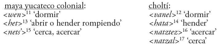 Respecto a las diferencias vocálicas que se observan entre este sufijo y su posible contraparte registrada en Chichén Itzá cabe mencionar que no es el único caso similar. A pesar de la relativa escasez de los datos lexicográficos del choltí, logramos encontrar una serie de ejemplos que marca la misma diferencia.