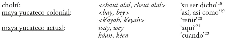 Ademas, si revisamos la entrada de Cordemex en la que se apoya García Campillo para su propuesta, encontramos ahí las formas <k’ulchahal> ‘ser adorado’ y <k’ultal> ‘adorar’ (Barrera Vásquez 1980, 421). Éstas contienen sufijos -chaj y -tal, respectivamente. El primero de ellos es uno de los sufijos incoativos que se ha encontrado en maya yucateco colonial (Smailus 1989, 33): <cool-chah-al, cool-chah-i, cool-chah-ac> ‘aflojarse lo apretado’. Llama la atención que en algunas variantes de maya yucateco contemporáneo este sufijo aún se usa para marcar las estructuras incoativas, igual que el sufijo -tal (Bricker, Po’ot Yah y Dzul de Po’ot 1998, 348; Lois y Vapnarsky 2003, 106-107).