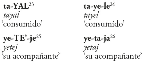 Para un fenómeno semejante en lacandón del sur, donde se alternan los sufijos -chäj y -tah, Martínez Corripio (2009) indica que podría existir una distinción respecto al grado de avance en el cambio de estado que codifique tal o cual construcción incoativa. Desgraciadamente, en nuestro caso la escasa cantidad de ejemplos y la imposibilidad de recurrir a una elicitación con los hablantes nativos no nos permite establecer la naturaleza de estas distinciones.