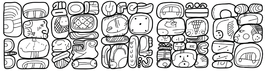 (A1) yi-li-wa (A2) ‘u-tzi-li (B1) tu-SAK-?-ni (B2) ‘u-cho-ko (C1) wa-?-’a-bi (C2) ka-K’UH-le-wi-ya (D1) ‘i-chi-la-11-TUN-ni (D2) ta-’AJAW-wa (E1) K’UH-lu-nu-ku-’AJAW (E2) ha-’i