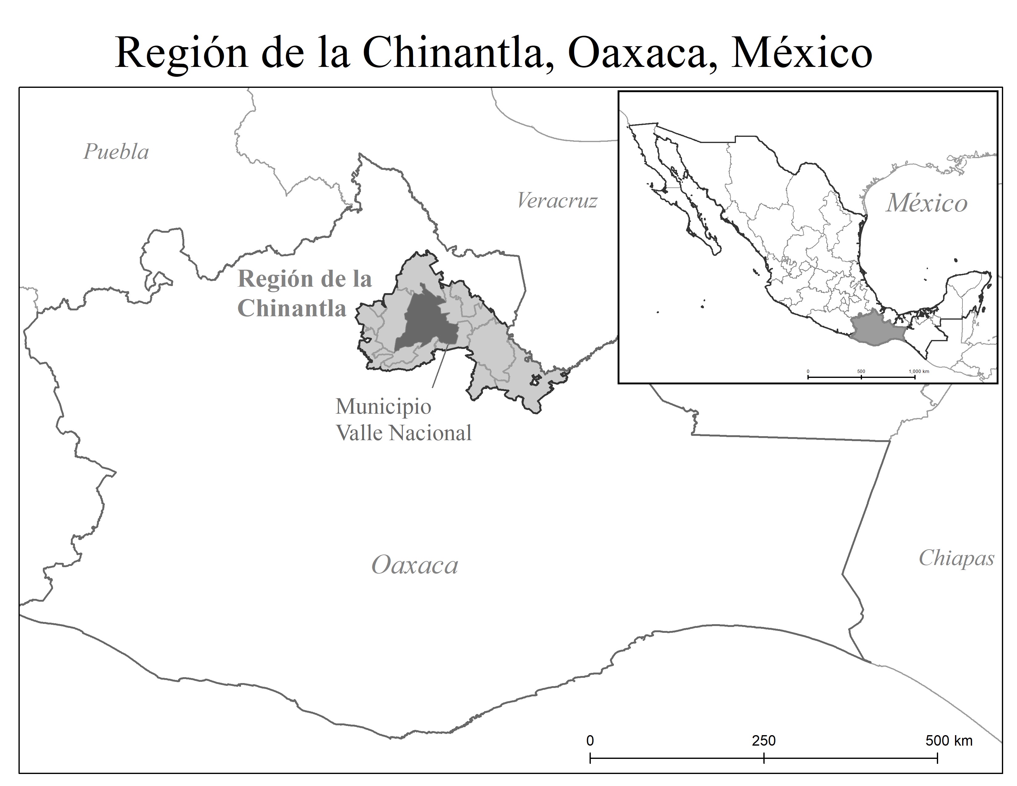 Región de Chinantla, Oaxaca, México (mapa elaborado por Andrea Gutiérrez Mendoza (Marco Geoestadístico Nacional INEGI, 2018).