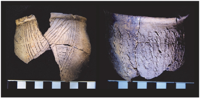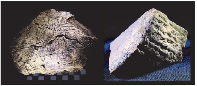 Exemplares de cerâmica com decoração plástica – corrugada e ungulada (foto: Rodrigo Simas Aguiar, 2019).