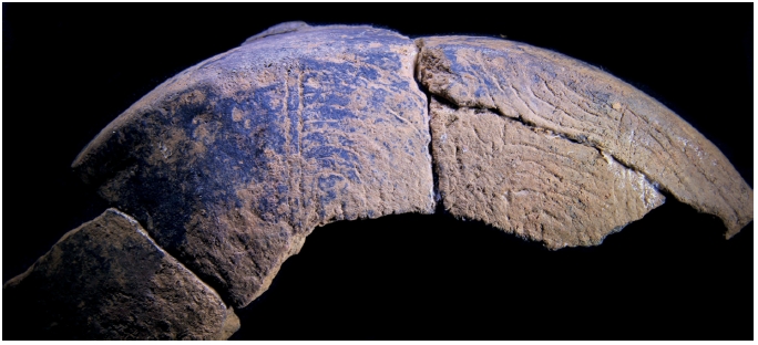 Cerâmica com decoração na ‘base’. Estigmas térmicos indicam que possivelmente tenha sido usada para cozinhar alimentos, contudo, a decoração aponta para a possibilidade de que originalmente a peça tenha sido concebida para servir de tampa (foto: Rodrigo Simas Aguiar, 2019).