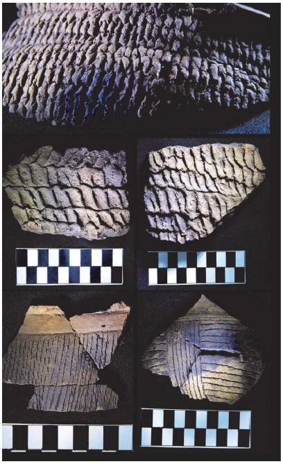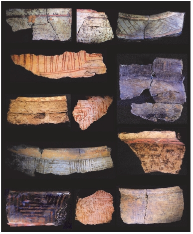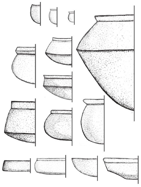 O diversificado repertório da cerâmica encontrada em Porto Caiuá vai desde pequenos copos, com nove centímetros de diâmetro por nove centímetros de altura e capacidade para, aproximadamente, 250 ml, até os grandes jarros capazes de armazenar dezenas de litros (Figura 11). A técnica de manufatura, em quase a totalidade dos casos, foi a acordelada (Brochado 1980), também conhecida como roletada (Scatamacchia 2004). Nos recipientes pequenos, com paredes de 3 a 5 mm, a técnica empregada foi a de modelagem em razão da impossibilidade de usar a técnica acordelada em paredes tão finas.