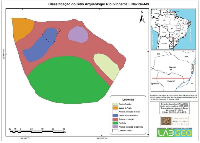 O sítio arqueológico Rio Ivinhema 1 está situado no Distrito de Porto Caiuá, Município de Naviraí, Estado de Mato Grosso do Sul, Brasil. Nele estão dispostos, por vasta área de superfície, remanescentes arqueológicos relacionados à tradição tupiguarani. Sua posição, em um braço de terra que se debruça por sobre o encontro das águas do Rio Ivinhema com o Rio Paraná, parece ter sido estratégica em termos de captação de recursos naturais, além de espaço privilegiado para o deslocamento canoeiro. Com efeito, ao conversarmos com pescadores locais, apareceram abundantes narrativas do tempo em que a pesca era permitida às margens do Ivinhema, de onde era possível se tirar quantidades satisfatórias de moluscos comestíveis, além da farta ocorrência de pescado. Já o Rio Paraná, em tempos pré-coloniais e coloniais, além de igualmente suprir demandas pesqueiras, fazia o papel de via hídrica, conectando os incontáveis aldeamentos que se desdobravam ao longo de sua margem. As ilhas que se formam no meio do Rio Paraná também eram locais privilegiados para acampamentos de caça e pesca, paragens ermas e piscosas com praias de areia fina. Dito isso, entende-se quão especial é o sítio Rio Ivinhema 1 em termos de situação geográfica.