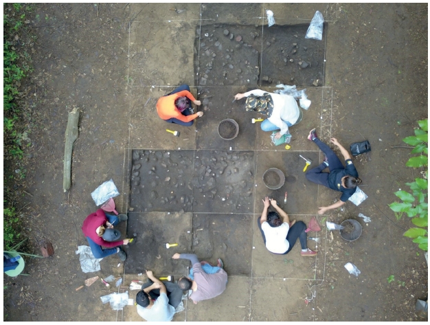 Na medida em que fomos abrindo o primeiro nível de outras quadrículas, percebemos estar diante de uma enorme área de cozinha, com profusão de fragmentos de cerâmica e fogueiras (Figura 3). Diante deste quadro, decidimos continuar com a escavação não mais por níveis artificiais, mas pela abertura de áreas maiores por decapagem. O objetivo, agora, era expor da melhor maneira possível as estruturas de cozinha. Ao final, escavamos no ponto central 17 das 45 quadrículas, chegando a uma parcela amostral de 37 % (Figura 4).