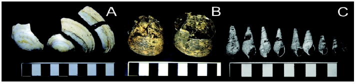 Malacofauna do sítio Rio Ivinhema 1: a) Anodontites (bivalve), b) Megalobulimus, c) Subulinidae (fotos: Rodrigo Simas Aguiar, 2019).