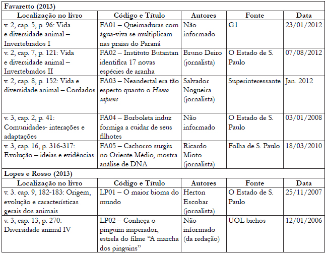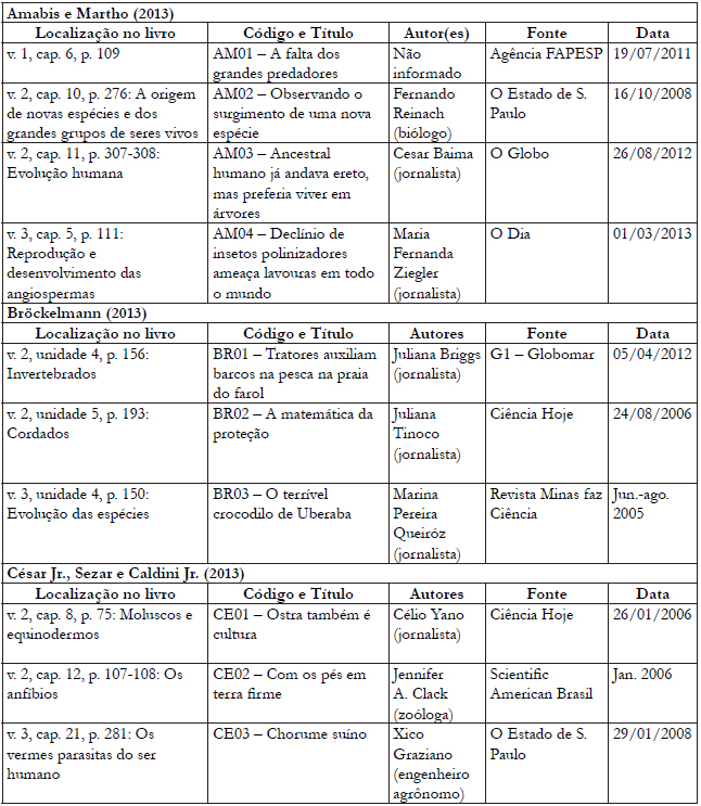Neste estudo, optou-se por analisar os originais dos textos que foram inseridos nos livros didáticos, encontrados em sites da internet cujos links estavam disponíveis nos próprios livros didáticos (com exceção dos textos CE02 e LP01, disponíveis apenas nas versões impressas, que foram consultadas para este estudo), de forma a entender o que despertou o interesse dos autores das coleções didáticas em selecioná-los. Estes textos eram alocados em três diferentes locais dos livros: no início dos capítulos, como motivadores; ao longo do capítulo, relacionado a algum assunto desenvolvido no texto didático; ou ao fim do capítulo, para contextualizar o conteúdo didático. O Quadro 1 reúne as principais informações a respeito dos textos analisados.
