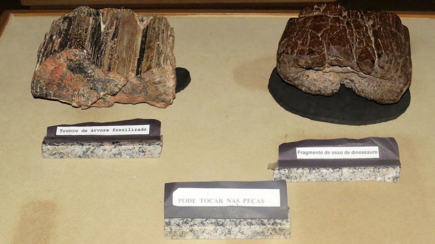 No que se refere aos tipos de objetos que compõem a exposição, estes são majoritariamente contemplativos e estão isolados dos visitantes por redomas de vidros e cordões, impossibilitando uma maior aproximação. No entanto, há duas peças (Figura 2), um fóssil de fragmento de osso de dinossauro e um fóssil de tronco de árvore, juntamente com uma placa contendo a indicação "pode tocar nas peças". Tais peças foram classificadas como manipulativas uma vez que a exposição permite aos visitantes terem contato físico com as peças.