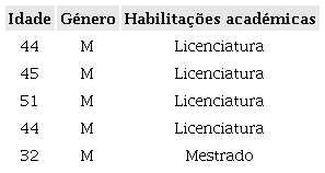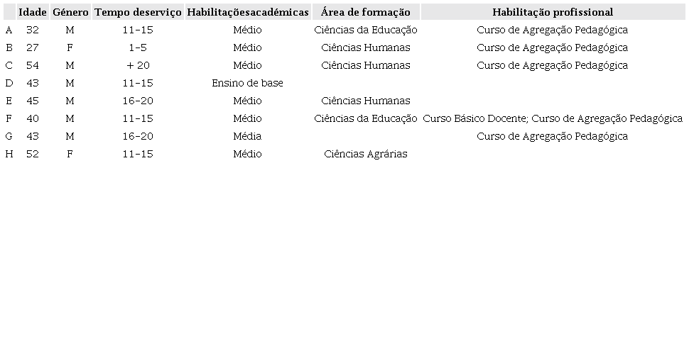 Para além dos docentes que lecionam nas escolas do Cassongue considerou-se pertinente entrevistar professores da Escola do Magistério do Sumbe, isto é, formadores dos referidos professores. Neste caso, contou-se com uma amostra de 5 docentes (Quadro 2), todos do sexo masculino e com idades compreendidas entre os 32 e 51 anos (amostragem de conveniência).