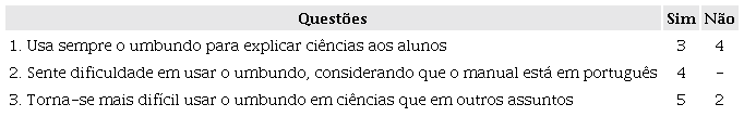 A nosso ver, verifica-se que está a existir um esforço para ensinar estes conteúdos em umbundo, mas as dificuldades também ficam evidentes nas respostas deste grupo de professores (Quadro 4).
