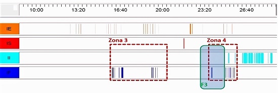 Leyenda: IE: Intervenciones de Empatía; IS: Intervenciones de Socialización; II: Intervenciones de Introducción; IF: Intervenciones de Focalización; En los primeros 15 minutos de entrevista sí ocurrieron intervenciones de empatía que no se visualizan por cuestiones de escala. Las Zonas 3 y 4 refieren al análisis de la distribución de intervenciones. F3 señala el fragmento analizado en la Parte II de la esta sección.