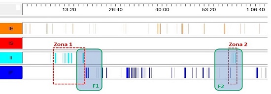 Leyenda: IE: Intervenciones de Empatía; IS: Intervenciones de Socialización; II: Intervenciones de Introducción; IF: Intervenciones de Focalización. Las IS no se visualizan por la escala del gráfico, pero sí ocurrieron, y por eso se incluyen en la codificación. Las Zonas 1 y 2 refieren al análisis de la distribución de intervenciones. F1 y F2 señalan los fragmentos analizados en la Parte II de la esta sección.