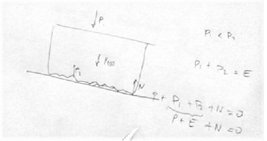 Estas intervenciones (las IF de los turnos 25 y 27 y la II del turno 29) permitieron abrir un camino de modificación de la ES: Observar la Inferencia "bajo el cubo sólo hay agua" e incorporar una nueva Inferencia, superadora de aquella: "hay, simultáneamente, contacto y presencia de agua". Un indicador interesante de este proceso son las alocuciones de los turnos 34 y 35. Allí, refiriéndose tanto a la consideración de 3 fuerzas (Peso, Empuje y Normal) en lugar de solo dos, o a la manera de modelar la superficie de contacto, dan cuenta de cómo cambió la ES luego de haber observado una inferencia e incorporado otra. De hecho, estas alocuciones dan cuenta del Consenso que han alcanzado sobre esa, ahora, ESC. Consenso que proceden a fijar en los minutos posteriores mediante dos dispositivos escritos: un dibujo que muestra el contacto entre las superficies a nivel microscópico y la ecuación que refleja la relación entre Peso, Normal y Empuje (Figura 3).
