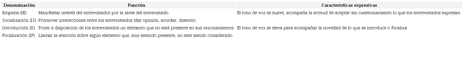Las dos primeras (IE e IS) tienen funciones fuertemente vinculadas con el plano social. Las dos siguientes (II e IF) tienen una función que incluye aspectos relevantes en el plano del conocimiento conceptual involucrado en las verbalizaciones. La Tabla 1 muestra las categorías construidas, las funciones que se le atribuyen y las definiciones que las operativizan.