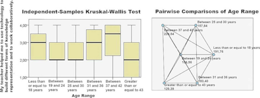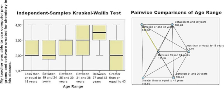 Regarding what is depicted in figure 1, it is clear that after performing the Kruskal-Wallis’s test of independent samples, exclusively for the assertion PTK3, revealed that there is no statistically significant effect of subjects of any age range on the claim, as noted in table 3, where it is evident that there is interference [X2 (5) = 12,354; p < 0,05]. According to this design, the Kruskal-Wallis’s test of independent samples was recalculated with the value of p being a value extremely near to the value to reject the null hypothesis, with no abnormality in the distribution of data in this category for PTK3. However, unlike what happened with the assertive PTK3, it can be observed in figure 2, where the idea of teachers being able to employ chemical software in their lectures is kept, that the only statistically significant difference is between the subjects aged 19 to 24 and subjects aged 37 to 42. In this diagram, based on the data in table 3, it can be stated that the Kruskal-Wallis’s test revealed that there is an influence of Age Range on the assertion TCK1 [X2 (5) = 11,278; p < 0,05].