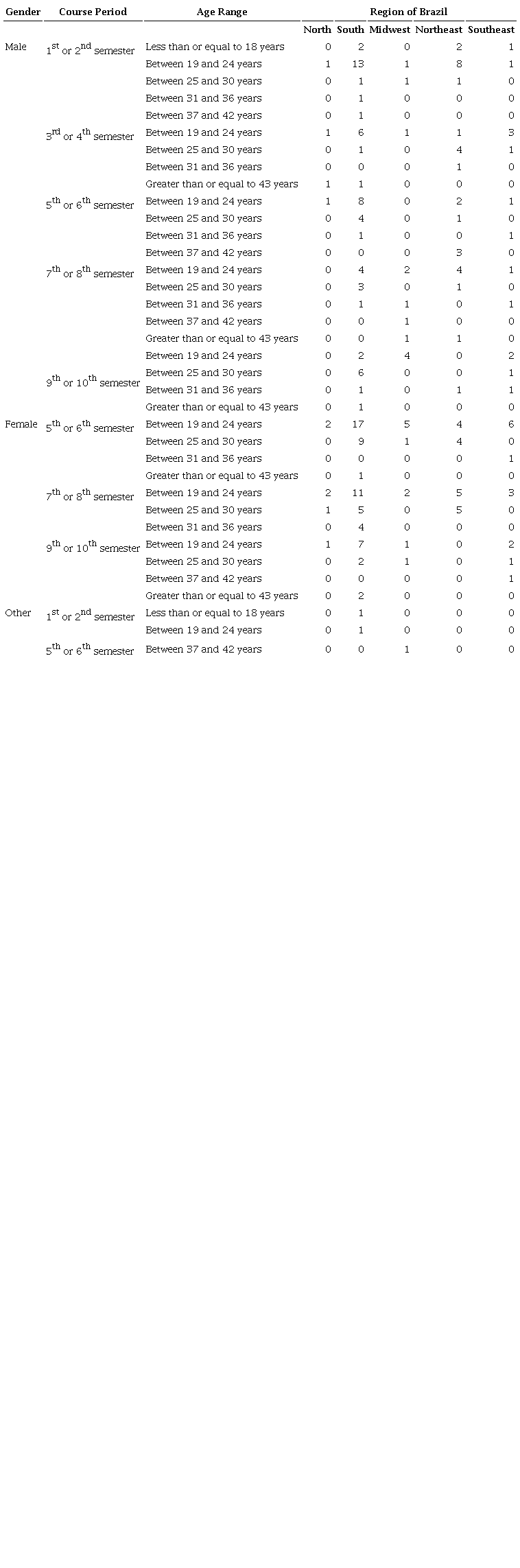 Due to the lack of normality in the data distribution, it was chosen to evaluate these statements using the Kruskal-Wallis non-parametric test, to the detriment of the descriptive analysis done for each of the statements contained in the three knowledge groups. This test was conducted utilizing legacy dialog boxes and the categorical factors listed in table 1, being: Gender (table 2), Age range (table 3), Region of Brazil (table 4) and Course Period (table 5). Analysis using this method was possible because each category has at least 3 subcategories. In addition, the analysis was run with a p value less than 0.05 considered significant (p 0.05) to reject the null hypothesis, assuming that there is category interference in the data distribution. If the p-value in any given analysis is larger than 0.05 (p > 0.05), the null hypothesis is kept, provided that there is no statistical interference by the category in the assertion.