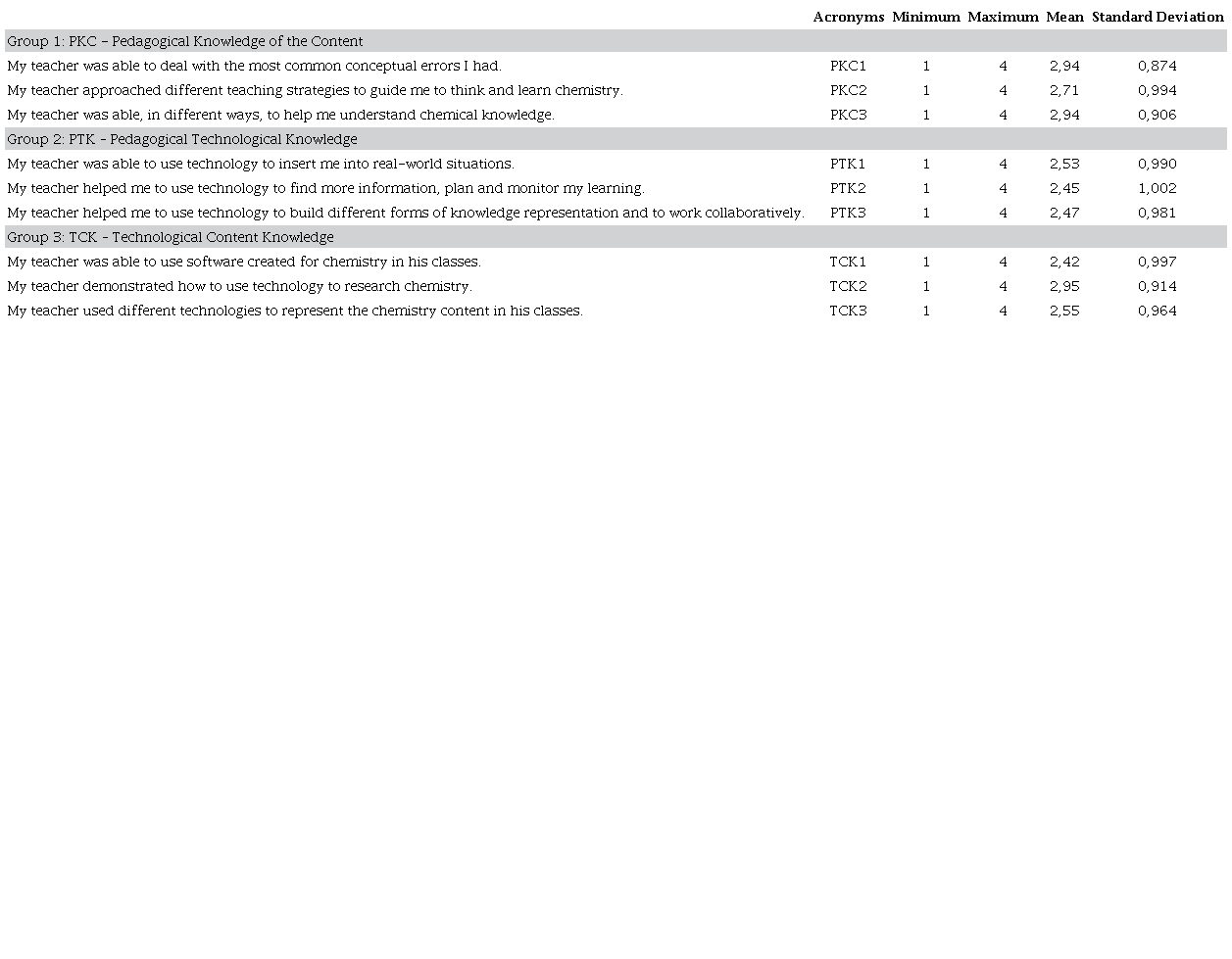 The Group 3 knowledge statements bring concepts to the subjects in order to assess the teacher's content knowledge connected to their technological knowledge; that is, the TCK is a specific knowledge of the teacher where technologies and scientific knowledge are reciprocally related; it is through this knowledge that the teacher establishes and determines, without a pedagogical link, which technology can be used to develop a given scientific content. It is critical for the educator to be able to link scientific knowledge to technology in such a way that both complement one another (COX, 2008). In this sense, it is an action that requires much more than just tinkering with technology, but knowing how to select it to present specific content. Given that the chemistry subject has special technical characteristics and that remote teaching requires teachers to have certain abilities and attitudes towards technology, it is clear from this line that the students agree with the statements. which favors the pedagogical skills in connection to this process.