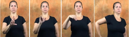 A escolha pelo uso dos sinais estrangeiros foi aplicada nos termos/palavras: ALAVANCA da SSL; FÊMUR da SSL; PERNA da SSL; PIXEL da SSL; PRÓTESE da CSL. O critério de escolha foi baseado na observação dos sinais disponíveis no Spread the Sign que melhor traduziam o significado do termo/palavra que precisávamos expressar. Por exemplo, utilizamos parte do sinal de FÊMUR feito na SSL (quadro 4) por ser bastante icônico. O sinal realizado em SSL para FÊMUR é composto. Nós escolhemos utilizar apenas uma parte do sinal, pois, como o surdo utiliza recurso visual e durante a atividade do centro de ciências itinerante o visitante pegaria o fêmur, esse sinal era descritivo e esclarecedor.