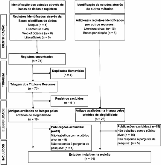 Inicialmente, foram identificados quatro estudos na Scopus, 49 na PubMed e seis na Web of Science, não sendo encontrado nenhum na Lilacs e SciELO. A partir dos resultados das bases de literatura cinza, foram identificados 15 artigos, totalizando 74 artigos. Foi realizada a eliminação das duplicatas, permanecendo para a próxima etapa 70 artigos.