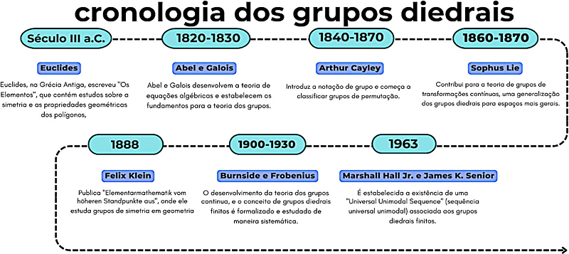 Do ponto de vista histórico, a criação dos grupos diedrais está relacionada ao desenvolvimento da Teoria dos Grupos e à compreensão da simetria em Geometria. Construímos uma linha do tempo (figura 1), com as principais contribuições matemáticas que embasam a sua criação e desenvolvimento: