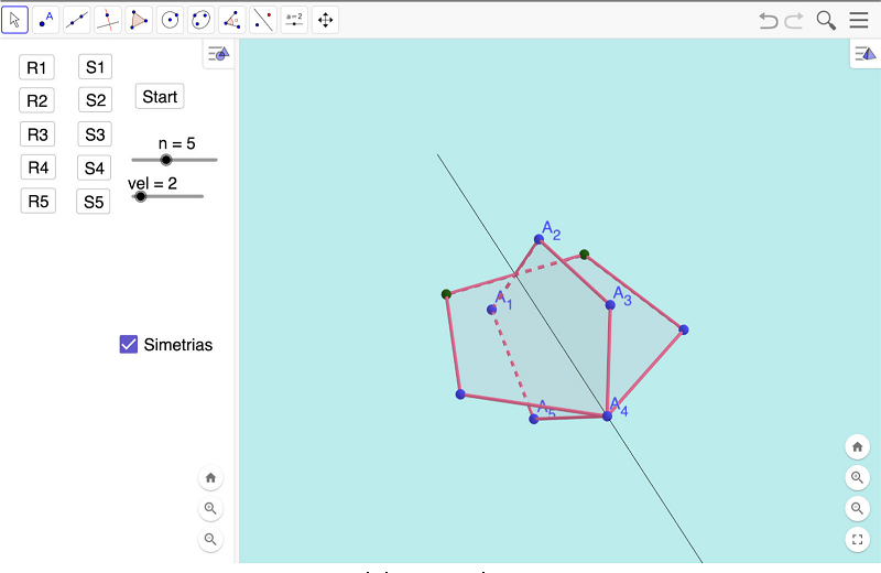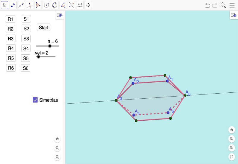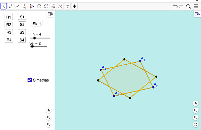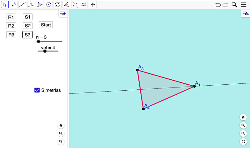 Na dialética de ação espera-se que os estudantes, de posse da construção, utilizem o GeoGebra para interagir com o polígono, experimentando diferentes rotações e reflexões a partir dos botões R1, R2 e R3 e S1,S2 e S3, observando como as simetrias se comportam conforme o número de lados do polígono varia. Almeja-se, da mesma forma, que verifiquem que os controles deslizantes n e vel alteram a quantidade de lados do polígono e a velocidade nos movimentos de rotação e reflexão, respectivamente. Os estudantes podem ser incentivados a registrar suas observações e descobertas de forma manuscrita.