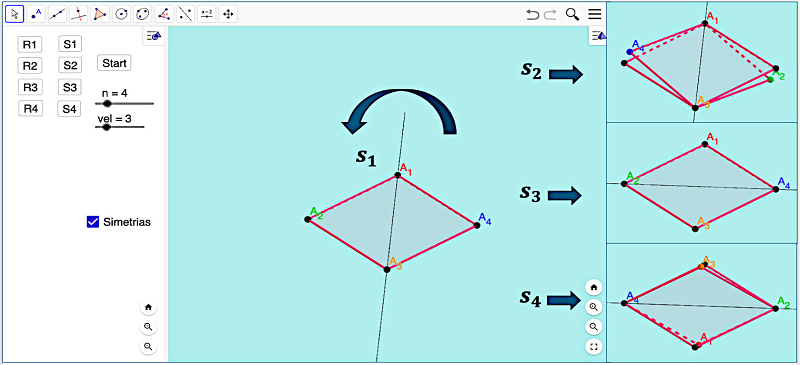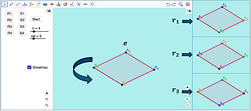 Desta forma, os estudantes podem provar as propriedades de grupos a partir de algum valor pré-fixado no controle deslizante n. Exemplificamos um dos valores que pode ser analisado pelos estudantes, em que adotamos n = 4, que seria o grupo diedral D4, referente a todas as simetrias de um quadrado. Este grupo é gerado por duas operações: uma rotação de 90° graus no sentido horário, denotada por r, e uma reflexão em relação a um eixo vertical, denotada por s. O conjunto de elementos do grupo D4 é {e, r1, r2, r3, s1, s2, s3, s4}, onde e é a identidade, ou equivalente a um movimento de 0°.