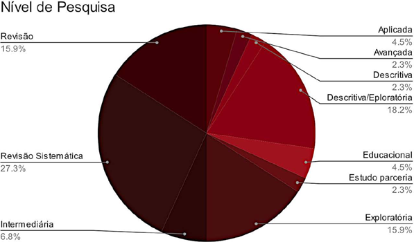Para análise das publicações utilizou-se uma ficha de tabelamento estruturada entre os seguintes tópicos: publicação, ano, título, instituição, metodologia, link, nível e público-alvo. Esses campos foram preenchidos com as informações específicas de cada artigo, após as leituras realizadas. Em especial, o campo denominado nível visava entender o tipo de pesquisa que estava sendo feita: ou seja, se se tratava de relato de experiência, revisão, revisão sistemática, exploratória, descritiva ou aplicada. Essas categorias auxiliam na compreensão qualitativa do universo da produção acadêmica sobre o tópico que está sendo investigado.