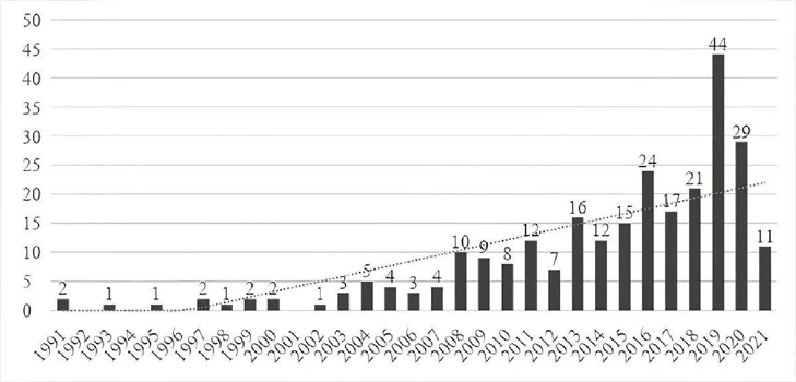 De forma geral, pode-se afirmar que, após 2008, quando a produção entrou em crescimento progressivo, a média anual da produção sobre o tema atingiu 17 trabalhos, com a quantidade mínima de sete estudos defendidos em 2012, e um pico máximo de 44 trabalhos defendidos em 2019.
