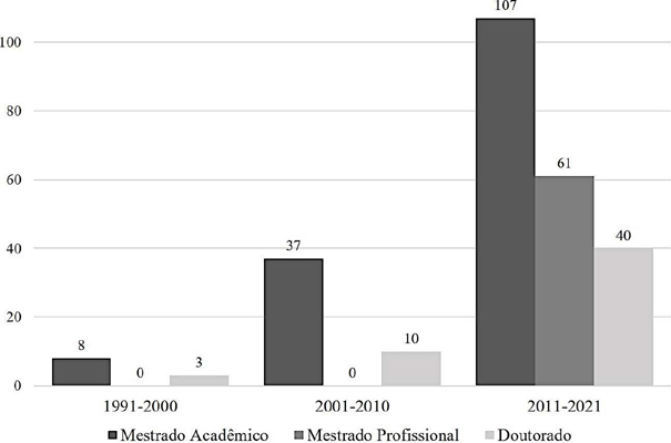 Importa destacar que a escassa quantidade de defesas de dissertações e teses sobre o ensino de evolução na primeira década situa-se no contexto de expansão dos programas de pós-graduação e do crescimento de estudos no campo educacional e no ensino de ciências, de forma específica, a partir da década de 1990 (Teixeira, 2021). Por sua vez, aponta-se a imprecisão da quantidade de trabalhos encontrada no ano de 2021 por conta da irregularidade ou atraso no cadastro da maioria dos trabalhos defendidos durante este período nas bases de dados consultadas. Isso pode ser explicado, pois “[...] existe um intervalo de tempo entre a defesa do trabalho e sua alocação nas bibliotecas depositárias” (Teixeira; Megid Neto, 2006, p. 268), o que implica em um cadastro tardio nos repositórios.