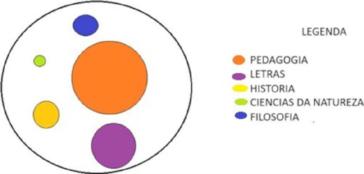 Em relação ao corpo docente da Faculdade de Educação (FE) da Universidade Federal de Goiás (UFG), considerando a formação inicial, existem diversos círculos esotéricos maiores como os especialistas em: Pedagogia, Filosofia e Letras, e também há círculos esotéricos menores como os especialistas em História, Matemática e Ciências Biológicas, representados na figura 1. Consideramos aqui que estes círculos esotéricos (e ao mesmo tempo exotéricos) constituem o Coletivo de Pensamento do curso de Pedagogia, foco da análise, uma vez que, para Fleck (2010, p. 157), “[...] um coletivo de pensamento consiste em muitos desses círculos que se sobrepõem e um indivíduo pertence a vários círculos exotéricos e poucos círculos esotéricos”.